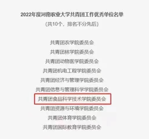 (通讯员 刘晓梦)为认真贯彻落实省委、团中央全会精神,进一步增强共青团委员会的政治性、先进性、群众性。1月9日,学校对2022年度河南农业大学共青团工作优秀单位名单进行公示。经过单位申报、公开讲评、评选投票等环节,我院荣获河南农业大学2022年度校共青团工作优秀单位。