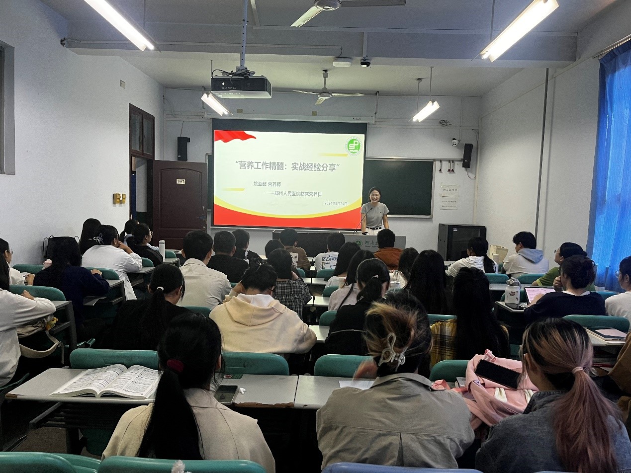 首先,姚亚茹营养师以《营养工作的精髓:实战经验的启迪》为题,首先向同学们全面介绍了郑州人民医院及临床营养科的工作概况。她还分享了在实际工作中所积累的经验与心得。例如:在营养干预工作中,她曾为一位糖尿病患者制定了个性化的膳食计划,通过减少高糖、高脂食物的摄入,增加富含膳食纤维的食物比例,以及合理安排餐次与进食量,该患者的血糖水平得到了有效控制,生活质量显著提高。随后,姚老师鼓励大家要拓宽信息视野,勇于抓住机遇,同时强调脚踏实地、勤勉工作的重要性,并特别提醒即将步入社会的同学们,无论是选择继续深造还是步入职场,都应明确自我定位,保持自信与理性,积极面对生活的挑战。
