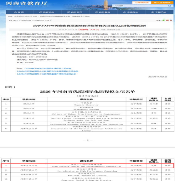 (通讯员 王银平)近日,河南省教育厅发布了《关于2026年河南省优质国际化课程等有关项目拟立项名单的公示》通知。全省共有40门课程入选,我院《食品工厂设计与环境保护》课程凭借其扎实的教学基础、创新的教学模式和显著的育人成效,成功获批2026年河南省优质国际化课程项目。