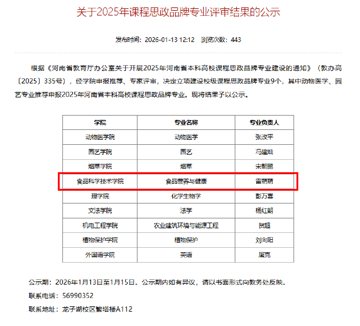 (通讯员 海丹)2026年1月13日,食品科学与技术学院食品营养与健康专业凭借扎实的建设基础、鲜明的思政特色和突出的育人成效,成功入选2026年河南农业大学校级课程思政品牌专业,标志着该专业在“立德树人”根本任务落实与课程思政建设融合发展方面迈上新台阶。