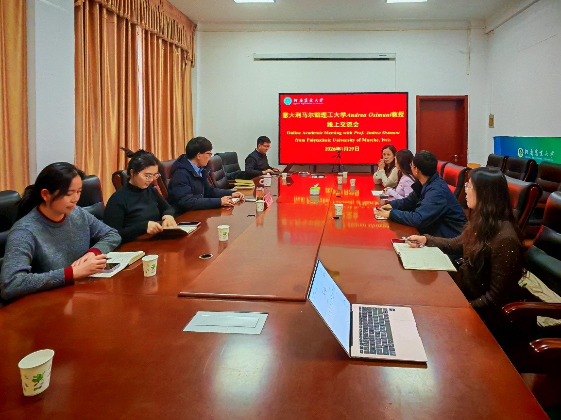 (通讯员 喻颢如 图片 潘馨苗)2026年1月29日上午,河南农业大学食品科学技术学院院长黄现青、李宁教授等8位教师代表与意大利帕尔马大学Andrea Osimani教授在线上开展科研交流会。双方围绕食品安全、发酵科研等领域展开了深入讨论与学术分享。