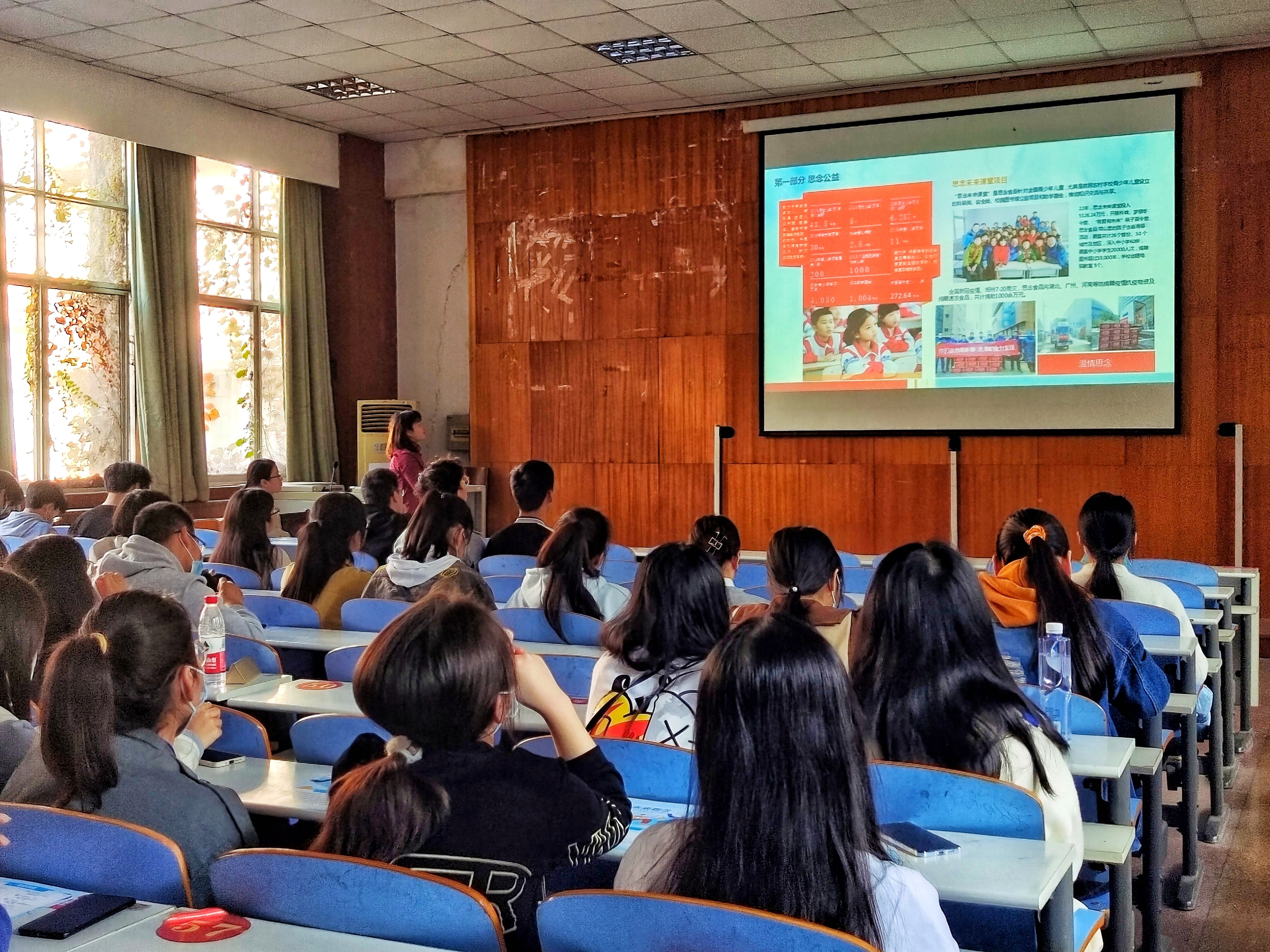 沈艳娜从公司简介、发展历程、思念文化等多个角度向同学们介绍了公司情况,让同学们进一步了解了公司的企业文化和企业氛围。随后,她对同学们关心的晋升路线、福利待遇等内容进行了详细讲解,她讲到,思念公司对于管培生有丰厚的优惠待遇,致力于让同学们在工作中提升自己,充分发挥个人能力,实行了721培训等多种人才培养方法,并针对同学们的不同能力和需求制定了不同的发展计划。最后,薛晗、司苗苗针同学们提出的一些问题进行了一一解答。