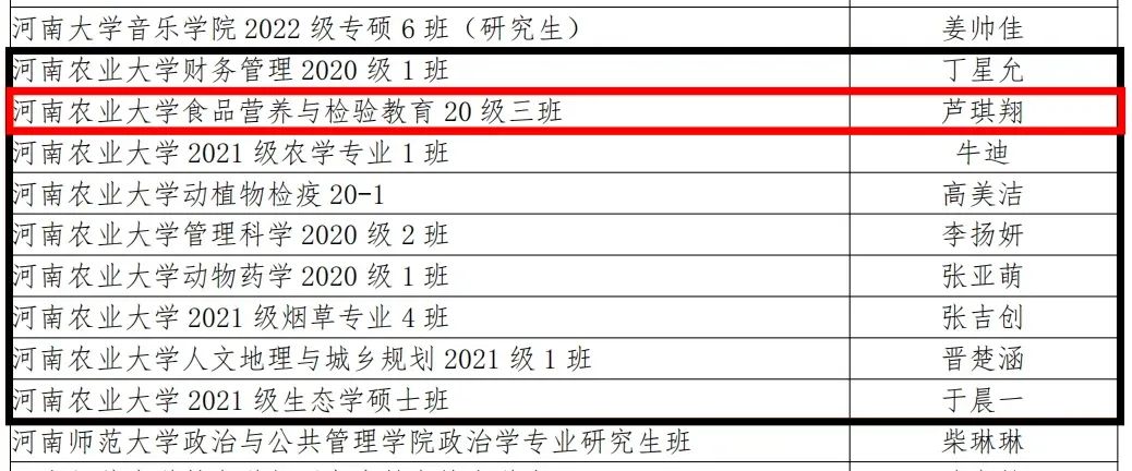 (通讯员 张鑫悦)根据《中共河南省委教育工委河南省教育厅关于开展2023年度全省教育系统“两创两争”活动先进集体和先进个人推选工作的通知》(豫教工委〔2023〕36号)文件精神,近日,省委高工委、省教育厅公布了2023年度全省教育系统“两创两争”活动先进集体和先进个人评选结果,我院食品营养与检验教育20级三班芦琪翔获评“河南省文明学生”。