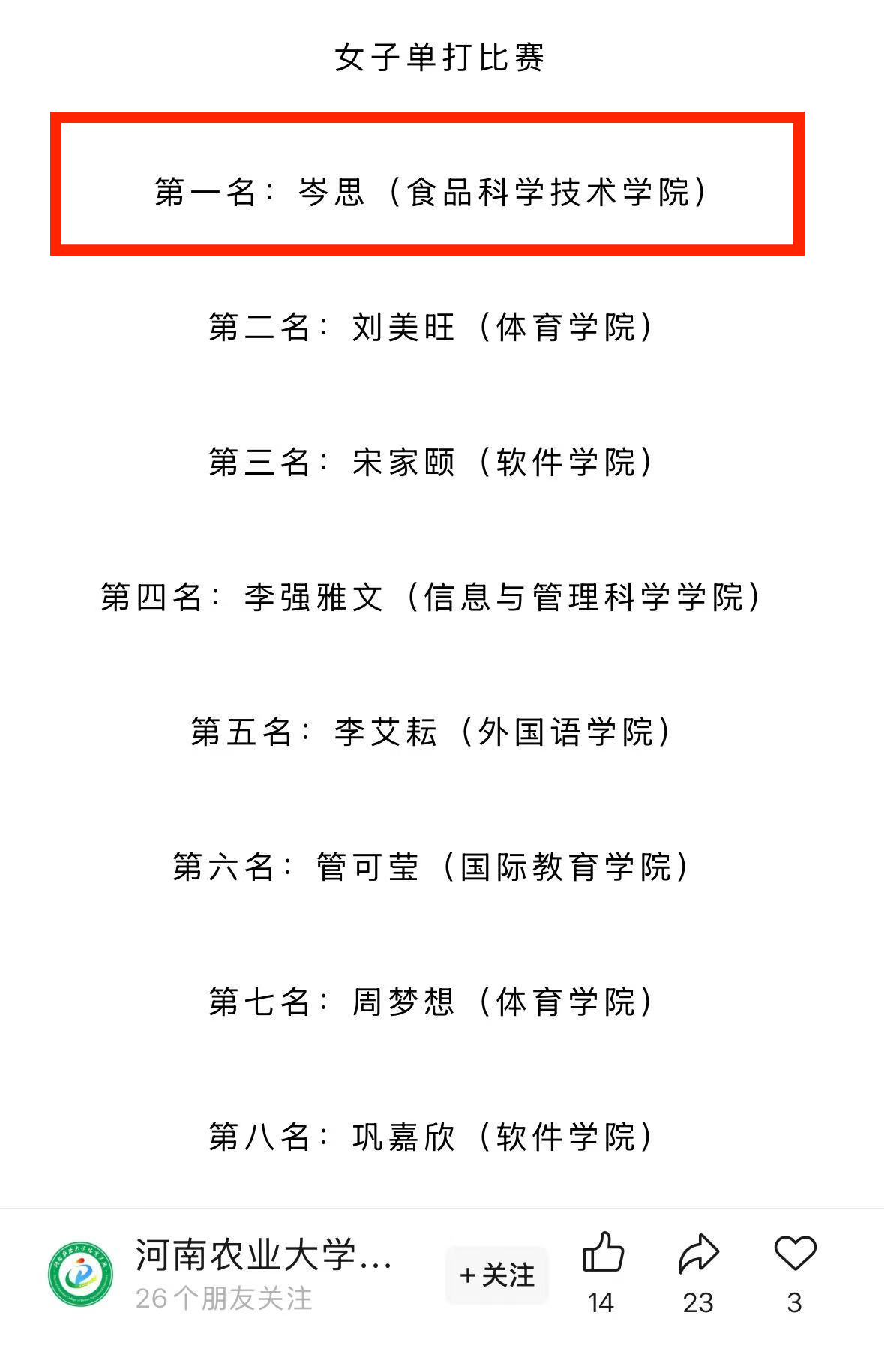 在我院运动员的不懈努力下,我院荣获团体比赛第一名。 此外,在单项比赛中,岑思同学斩获女子单打桂冠;余屹博与刘书静组合获得混合双打第四名。