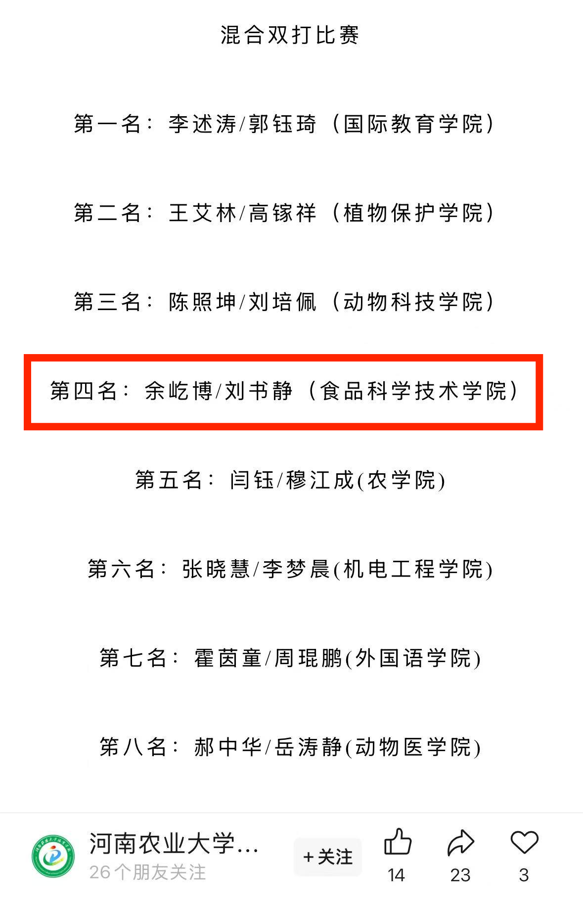 (通讯员 崔佳宁)在2025年河南农业大学“以体育人·强智健体”学生体育竞赛系列活动之学生羽毛球比赛中,我院学子在赛场上挥拍逐羽、意气风发,历经多轮激烈角逐,最终凭借精湛的球技、默契的配合与顽强的斗志斩获佳绩。