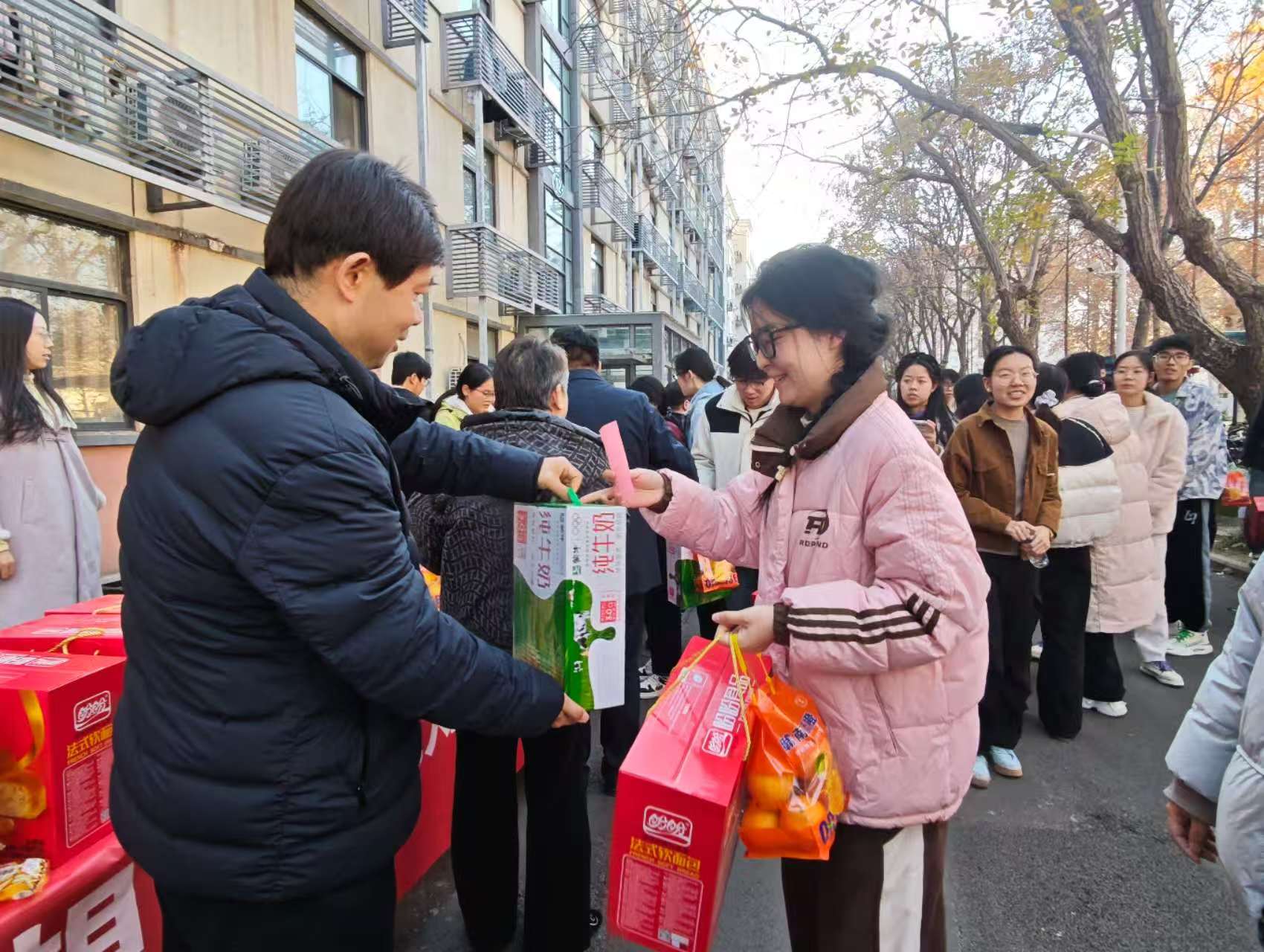 最后,领导老师们亲手为同学们送上了精心准备的暖心物资——新鲜饱满的橙子、松软可口的面包与营养醇厚的牛奶。一份份物资承载着学院对学子们的深切关怀与殷切期望,也传递着最真挚的祝福:愿同学们“橙”载梦想,乘风破浪;“包”揽知识,落笔生花;“牛”力加持,勇往直前!同学们接过这份沉甸甸的温暖,脸上绽放出灿烂的笑容,纷纷表示将把这份关怀转化为备考的动力,以更加昂扬的姿态投入到后续的复习中,不辜负学院的信任与期待。