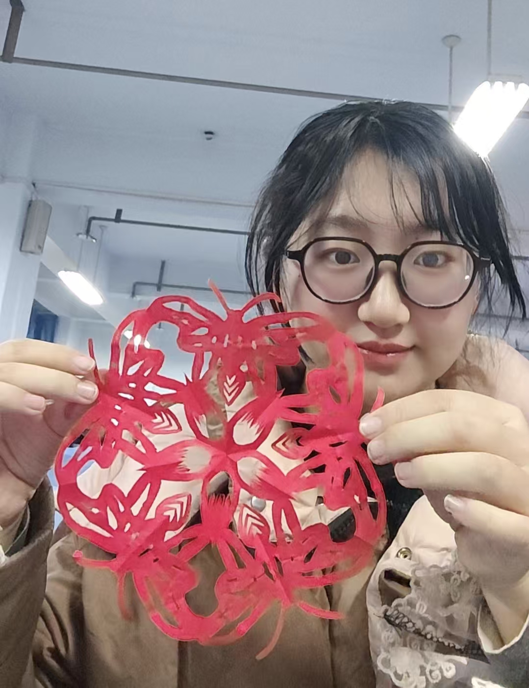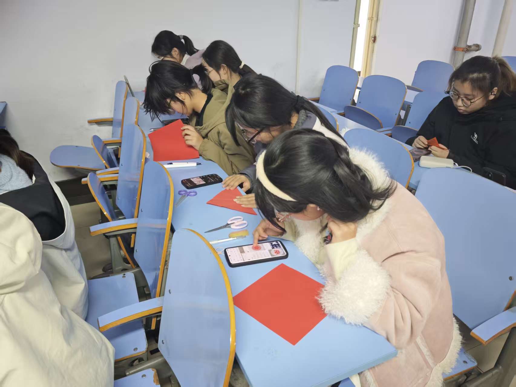 一方红纸、一把剪刀、一块垫板,共同构成了同学们大显身手的实践舞台。红纸在学子们手中灵活翻飞,有人紧随教学,将“春”字剪裁得活灵活现;有人大胆创新,让传统剪纸技艺焕发青春活力;更有同学结伴协作,共同完成组合类剪纸作品。