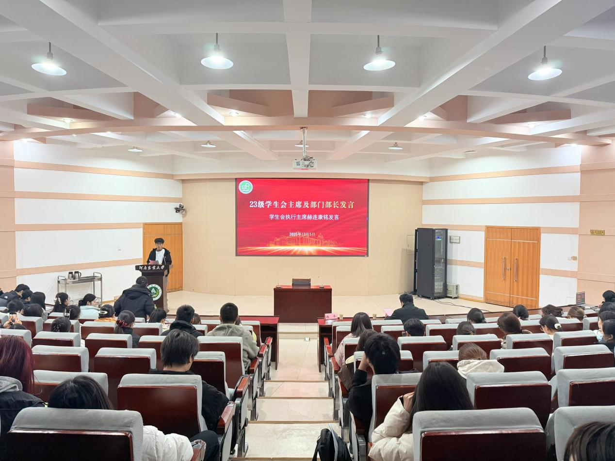 大会伊始,23级学生会相关负责人依次上台发言。他们全面回顾了过去一年在组织建设、活动开展、服务同学等方面的工作成果,坦诚剖析了工作中存在的不足与改进方向,对老师的悉心指导和同学们的通力协作表达了诚挚感谢,并寄语新一届成员接续奋斗、再创佳绩。