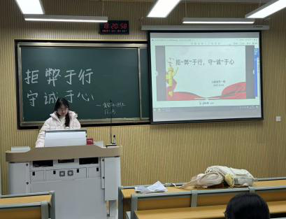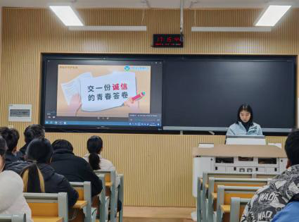 活动期间,各团支部围绕“学诚信、践诚信、传诚信”这一核心主题,开展了“拒‘弊’于行,守‘诚’于心”的主题班会,各班班主任全程参与其中。班长和团支书向同学们详细解读了考试违纪作弊的严重危害,旨在帮助大家树立正确的价值导向。此外,还组织同学们观看了诚信考试宣传动画及警示教育视频,通过直观的画面普及违纪的严重后果。同时,我院全体同学签订了《诚信考试承诺书》,以书面形式明确各自的责任与义务,进一步强化了诚信自律意识。
