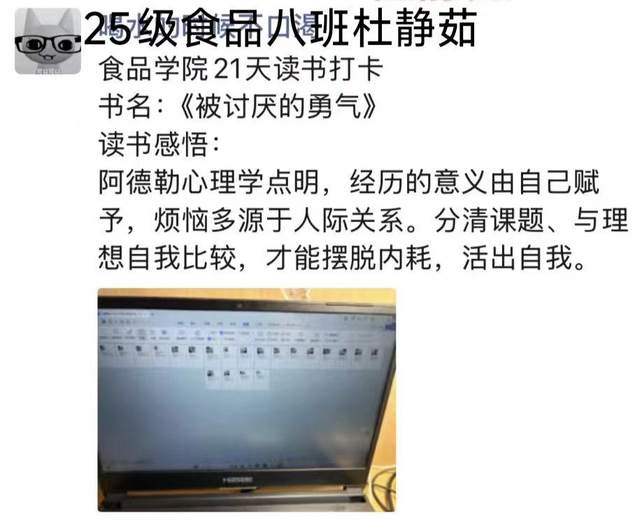 (通讯员 王蕊)为持续推进校园阅读文化建设,帮助同学们在文字中拓展认知、涵养品格,我院学生会开展“21天读书打卡”活动。