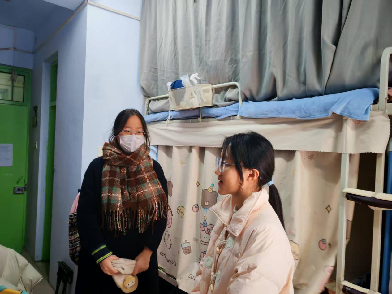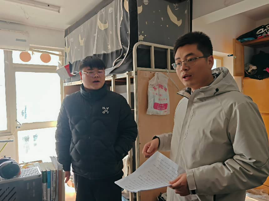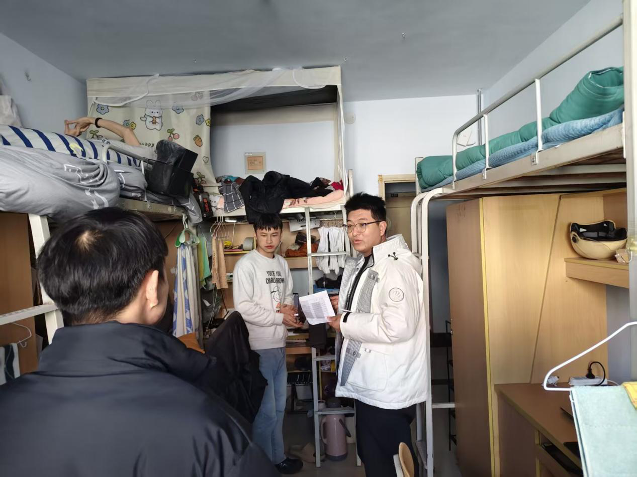 1月7日,院党委组织员陈翔、团委副书记张金龙、辅导员喻颢如、银峰、班主任老师深入学生宿舍进行走访排查。在排查中,老师们围绕用电安全,卫生状况等方面展开了细致检查,叮嘱同学们重视宿舍用电安全,自觉维护宿舍卫生环境,同时对正在积极备考的同学们表达慰问,了解大家的复习进展与生活需求,提醒注意防寒保暖、合理作息,并且鼓励同学们保持积极乐观的心态,以最佳状态迎接考试。此外,老师们着重开展诚信考试教育,引导同学树立正确的应考观念,维护公平公正的考试环境。