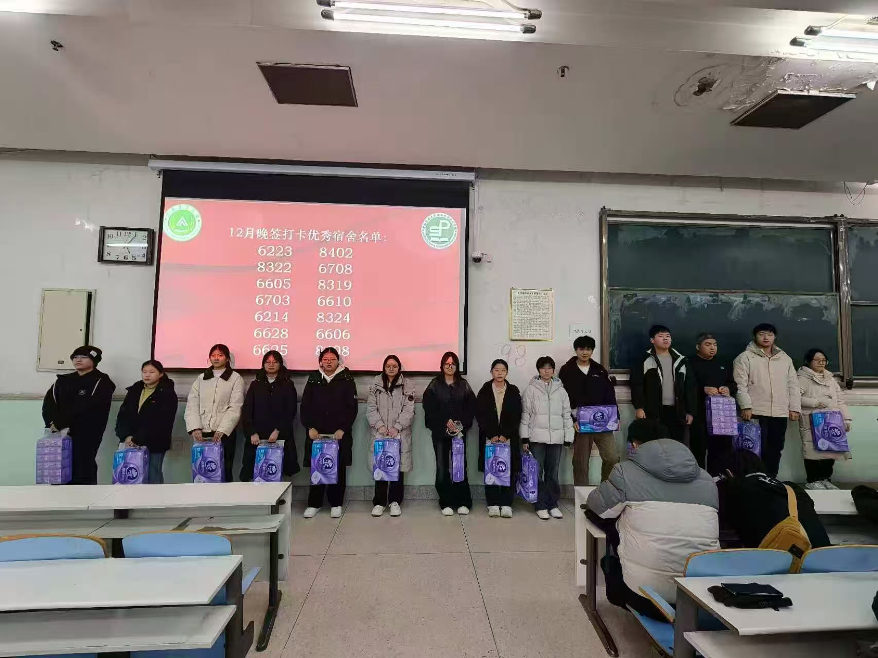 会上,学院对在晚签打卡中表现突出的“先锋寝室”予以表彰并颁发奖品,以激励同学们保持良好作息,共同营造安全、有序的住宿环境。