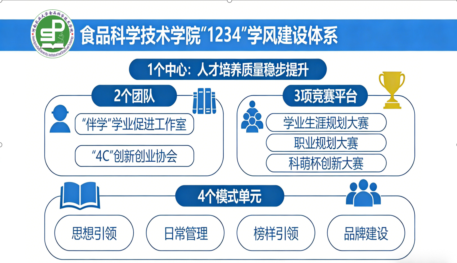(通讯员 刘宗易) 我院深入学习贯彻习近平总书记关于教育的重要论述,围绕学校“勤学•笃行学风建设活动”总体部署,以“思想引领、日常管理、榜样引领、品牌建设”为思路,着力强化学风建设。通过实施“1234”体系,引导学生明确学习目标、转变学习观念,实现“从要我学到我要学”的根本转变,学生出勤率、就业率稳步上升,旷课率、挂科率、违纪率明显下降,学院连续荣获校学风建设先进单位称号,为培养食品产业卓越工程师奠定坚实基础。